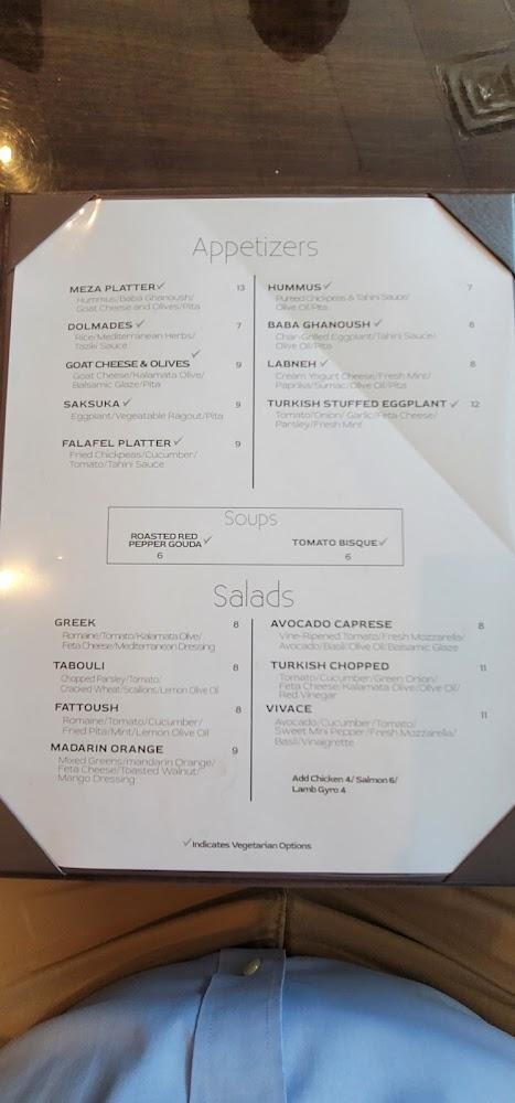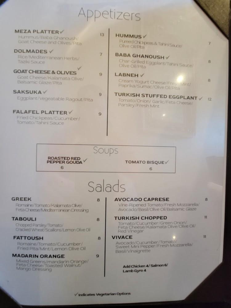 The menu at Vivace features a variety of Mediterranean delights. From fresh salads to hearty entrees, there's a selection for every craving. Popular dishes include lamb kebabs and savory gyros, each celebrating traditional flavors.