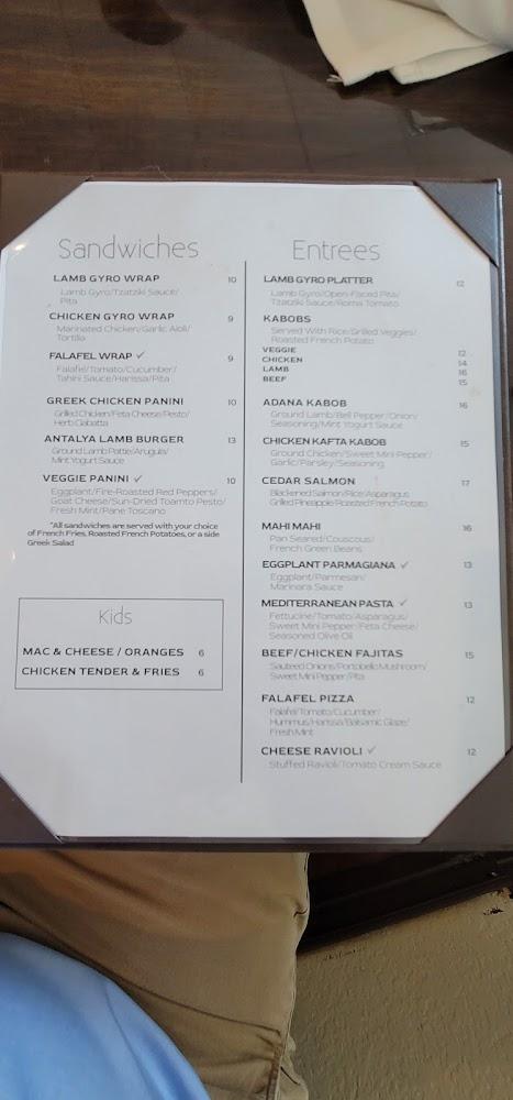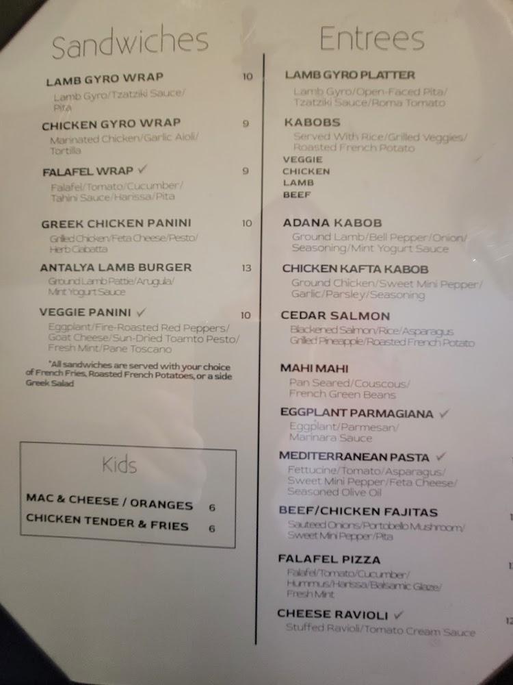 The lunch menu is diverse with options like gyros, sandwiches, and shareable appetizers. Prices remain budget-friendly, making it an appealing choice for a casual lunch or dinner. Don't miss the homemade hummus and warm pita, they are perfect complements to any dish!